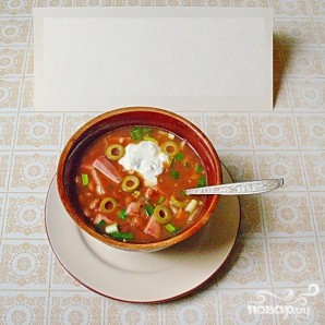 6. Готовую похлебку наливаем в глубокую тарелку или в глиняную миску, добавляем ложечку сметаны и порезанных зеленых оливок.