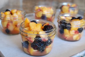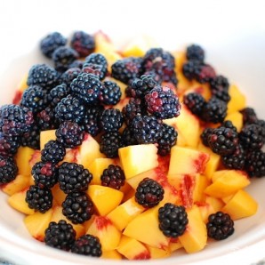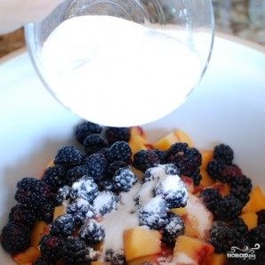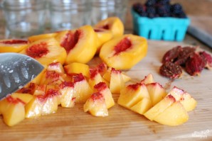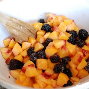 Ежевику промываем и смешиваем с нарезанными персиками.