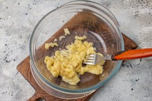 Бананы очистите от кожуры, мякоть выложите в миску и разомните вилкой.