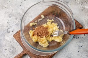 К размятым бананам добавьте какао-порошок, перемешайте.