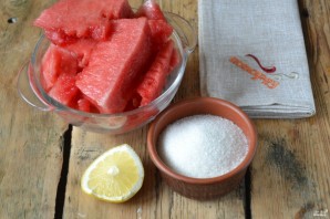 Подготовьте все необходимые ингредиенты. В ингредиентах я указала количество сахара и лимона на 1 кг арбузной мякоти, из этого количества продуктов у вас получится 2 баночки объемом по 200 мл.