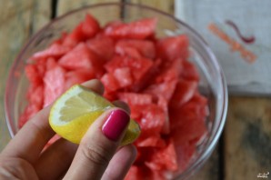Арбузную мякоть очистите от семян, порежьте на куски произвольного размера. Добавьте измельченную цедру лимона и лимонный сок. Туда же всыпьте сахар и оставьте на 30-60 минут.