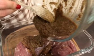 3. Мясо переложите в контейнер с крышкой, залейте приготовленным ранее маринадом, хорошенько разотрите маринад по мясу.