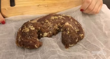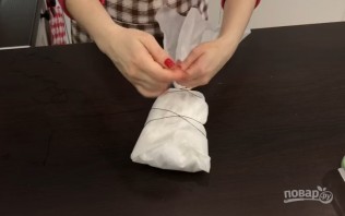 7. Мясо в марле заверните в пергамент и обвяжите капроновой ниткой, подвесьте балык на 10 дней при температуре не выше 20 градусов.