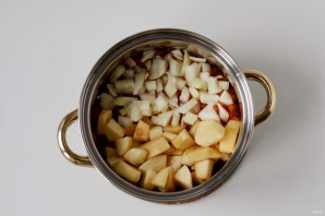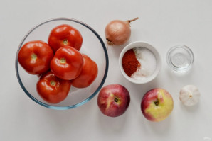 Лук нарежьте кубиками. Яблоки очистите от кожуры, удалите сердцевину и нарежьте кубиками. Переложите в кастрюлю к помидорам и варите 40-45 минут.