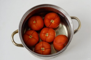 Помидоры помойте, сделайте разрез крест-накрест около плодоножки. Залейте кипятком и оставьте на 10 минут.