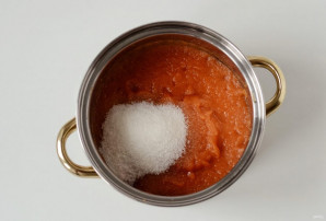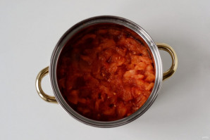 Снимите кожицу у томатов, удалите семена. Нарежьте помидоры кубиками. Переложите в кастрюлю и варите на среднем огне 15 минут.