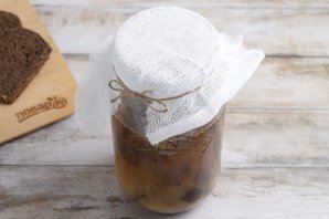 Затяните банку марлей и оставьте бродить на 36 часов. После процедите квас, перелейте в посуду для хранения и уберите в холодильник.