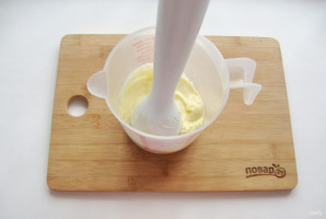 Опустите блендер в стакан и накройте им яйцо. Через несколько секунд майонез начнет густеть и заполнять стакан. Когда вся жидкость загустеет, можно будет продолжать взбивать поднимая блендер и опуская. Через несколько секунд майонез будет готов.