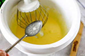 Взбейте куриные желтки в течение 3-4 минут до побеления. Обязательно взбейте их как следует, иначе масло не будет в них вмешиваться. Как только это произойдет, начните вливать масло буквально по капле, не прекращая взбивать.