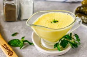 Готовый майонез перелейте в соусник, он получится немного более жидким, чем обычный домашний майонез на желтках и будет более светлым.