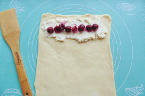 Из указанного количества ингредиентов получается два пирога. Разделите тесто на две части. Одну часть отложите, а вторую раскатайте в пласт толщиной 3-4 мм. На край пласта выложите творог с вишней.