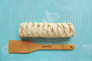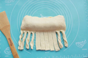 Половину пласта, в которой нет начинки раскатайте и нарежьте на полоски. Каждую полоску прокрутите 3-4 раза.