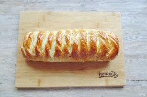Сверните тесто с начинкой и полосками в виде рулета. Вот такой симпатичный пирог получается.