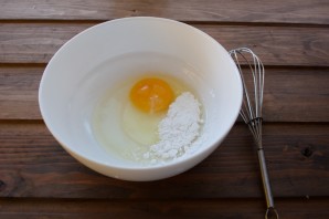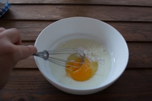 В миску вбиваем 1 яйцо, сахар, соль, разрыхлитель.