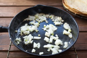 Нарезаем репчатый лук и обжариваем его до румяности.