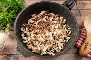 Переложите начинку в глубокую миску. Дайте остыть. Добавьте тёртый на мелкой тёрке сыр (немного оставьте для верха), майонез добавьте по вкусу. Дополнительно можно добавить свежую зелень, у меня петрушка и укроп.