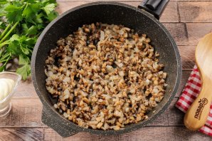 Подготовленной начинкой наполните шляпки шампиньонов. Выложите в чашу аэрогриля.