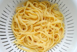 В кипящей подсоленной воде отварите до готовности пасту фетучини. Откиньте пасту на дуршлаг.