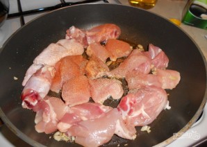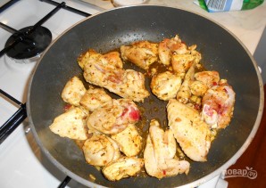 Выкладываем куриную грудку, порезанную кусочками. Обжариваем, посолив и поперчив по вкусу.