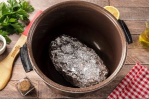 Сверху выложите несколько долек лимона. И готовьте до звукового сигнала.