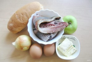 Для приготовления форшмака потребуется: филе сельди, яблоко зеленое, лук репчатый, яйца, белый батон, сливочное масло.