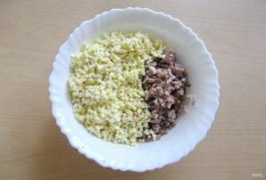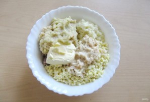 Яблоко также пропустить через мясорубку и добавить в форшмак. Последним добавить мягкое сливочное масло.