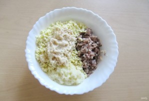 Добавить репчатый лук и батон, которые также перемолоть в мясорубке.