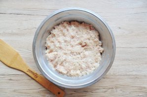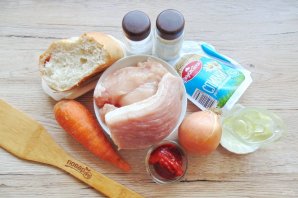 Белый батон залейте кипяченой холодной водой и через 5 минут отожмите. Одну луковицу очистите и промойте. Куриное филе и мякоть свинины промойте. Все эти ингредиенты пропустите через мясорубку.