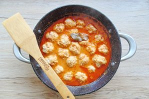 Приготовленной подливкой залейте фрикадельки. Добавьте лавровый лист.