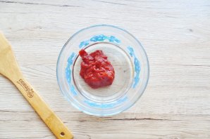Приготовьте подливку. В миску выложите томатную пасту.