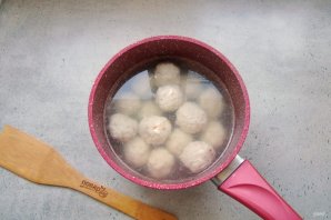 Из фарша сформируйте небольшие шарики. Воду в кастрюле доведите до кипения, немного посолите и выложите фрикадельки. С момента закипания варите их 10-15 минут и доставайте из кастрюли.