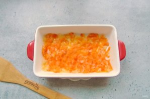Одну луковицу мелко нарежьте, а морковь натрите на терке. Выложите в сковороду с подсолнечным маслом. Пассеруйте овощи до мягкости на среднем огне. Затем выложите в огнеупорную форму для запекания.