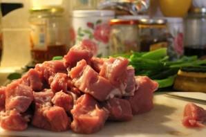 Для начала наливаем в сковороду оливковое масло и обжариваем на нем нарезанный мелко репчатый лук до золотистого цвета. Затем нарезаем свинину небольшими кубиками и выкладываем на сковороду к луку. Жарим до румяной корочки, а затем вливаем белое вино, продолжаем тушить мясо на медленном огне. Когда вино практически полностью выпарится, мы доливаем на сковороду немного воды так, чтобы она не накрывала свинину полностью. Закрываем сковороду крышкой и готовим мясо минут 20-25.
