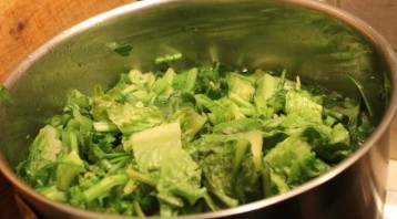 Пока свинина готовится, мы наливаем в кастрюльку воду, солим ее и отвариваем в ней нарезанный сельдерей и листья салата в течение 10 минут.