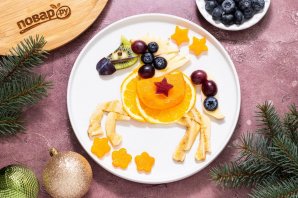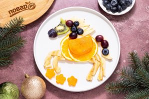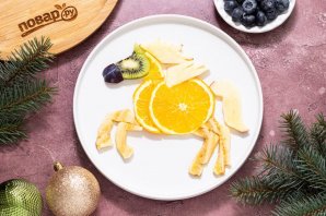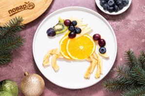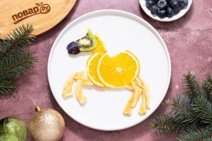 Добавьте глаз лошади из бутона гвоздики и дополнительных элементов декора из яблока и хурмы. Пустые места на тарелке можно заполнить ягодами и виноградом, украсить свежей мятой.