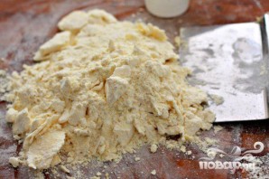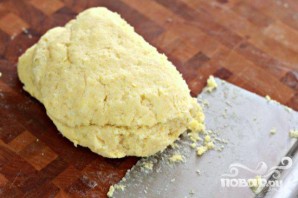 1. Сливочное масло охладить и нарезать кусочками. Просеять вместе муку, кукурузную муку и соль. Добавить масло и перемешать, пока смесь не будет напоминать крошки. Добавить воду и перемешать.