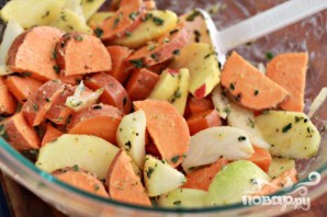 3. Тем временем приготовить начинку. Нарезать шалфей и тимьян. Разрезать яблоко пополам и извлечь сердцевину. Разрезать каждую половинку на 8 ломтиков и положить их в большую миску. Нарезать сладкий картофель кубиками и нарезать лук дольками, добавить к яблокам. Добавить сливочное масло, шалфей, тимьян и перемешать осторожно. Посолить, поперчить и снова перемешать.