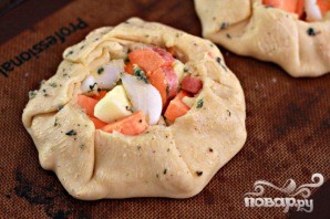 4. Разогреть духовку до 200 градусов. Раскатать тесто на слегка посыпанной мукой поверхности в круг диаметром 30 см. Выложить тесто на противень и смазать горчицей. Начиная за 5 см от края, выложить сладкий картофель, лук и яблоки со специями. Завернуть края. Выпекать до тех пор, пока яблоко, картофель и лук не станут нежными и слегка карамельного цвета, около 55 минут. В то время как галет готовится, довести клюквенный сок до кипения, пока он не уменьшится наполовину. Охладить галет и полить клюквенным соком. Нарезать на кусочки и подавать.