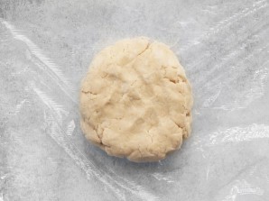 3. Вливайте в мучную крошку по столовой ложке холодной воды, затем соберите тесто в единый ком и оберните его в пленку. Отправьте тесто на 1 час в холодильник.