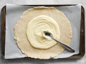 7. Достаньте тесто из холодильника и раскатайте его в круг около 30 см. По центру выложите сырную массу.