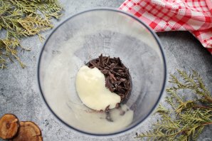 Влейте к шоколаду со сгущенкой набухший желатин и горячую сахарную массу. Все пробейте блендером до однородной массы.