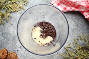 Шоколад мелко порубите и выложите в высокий стакан для взбивания. Добавьте к шоколаду сгущенное молоко.