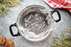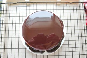 Готовую шоколадную глазурь сразу выливайте на замороженный муссовый торт, который стоит на решетке.