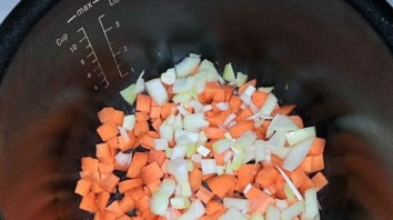 Морковь хорошо промываем, нарезаем кубиками. Лук чистим и произвольно измельчаем. Морковь и лук кладем в чашу мультиварки.