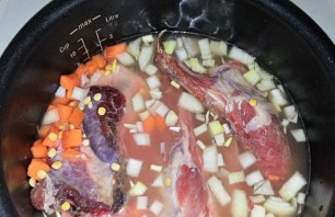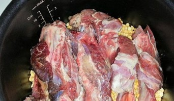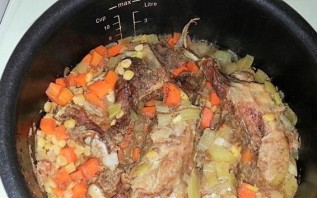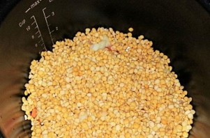 Добавим соль и воду. Аккуратно, чтобы не повредить чашу мультиварки, перемешаем продукты. Закрываем крышку, устанавливаем режим «Тушение» и оставляем варить гороховую кашу в мультиварке. Время приготовления гороха и говядины 2 часа.