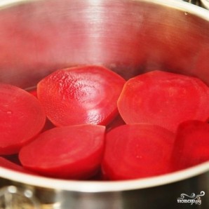 Свеклу чистим, разрезаем на несколько частей и кладем в кастрюлю. Туда же наливаем 2 литра воды. Ставим на огонь и варим до готовности свеклы. Получившийся свекольный отвар не выливаем - он нам еще пригодится.