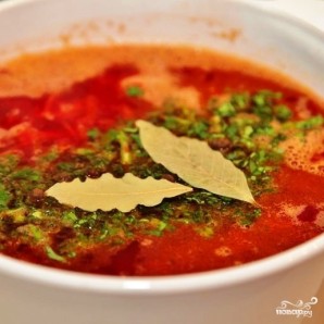 Берем крупную кастрюлю, наливаем туда свекольный отвар и еще примерно полтора литра воды. Туда же кладем натертую свеклу и поджарку со сковороды. Туда же добавляем лавровый лист, зелень и соль по вкусу. Ставим кастрюлю на медленный огонь, накрываем крышкой и томим еще 20 минут.