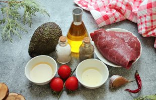 Подготовьте все необходимые ингредиенты для приготовления говядины на подушке из авокадо.