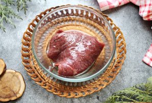 Стейк говядины сполосните, обсушите и выложите в миску. Полейте его уксусом, посолите, поперчите, добавьте измельченный чеснок и дайте постоять в течение 30 минут.